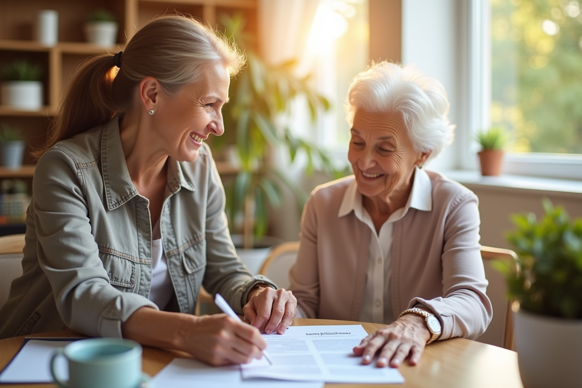 Assistante sociale aidant une personne agee dans un centre lumineux